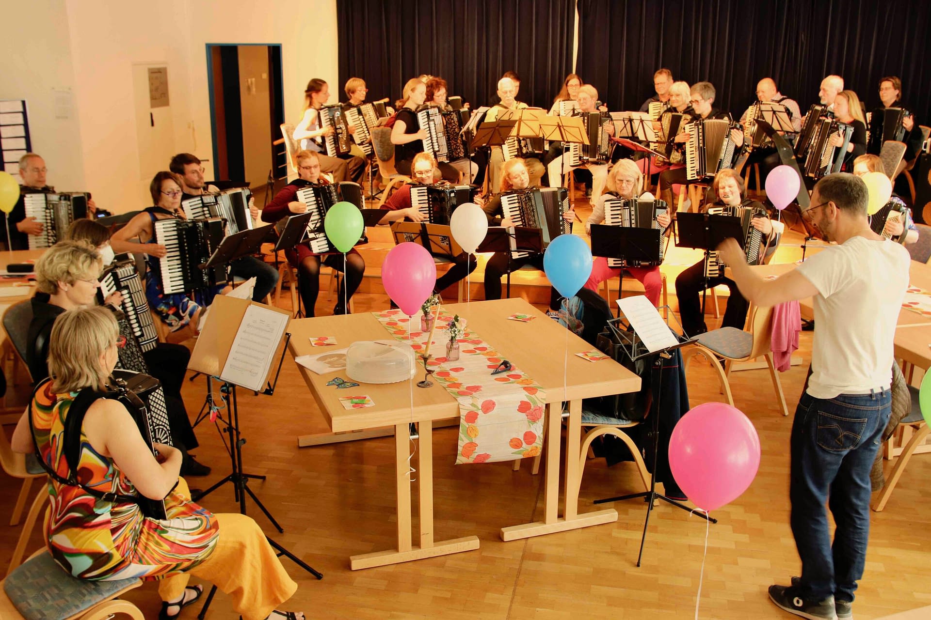 Ende Mai haben wir in großer Runde und mit zweijähriger Verspätung das 35. Jubiläum von Euphonia und den Geburtstag von Sonja gefeiert. Wir haben uns besonders gefreut, dass sich so viele ehemalige Mitspielerinnen und Mitspieler auf den Weg nach Berlin gemacht haben, um bei diesem Fest dabei zu sein. Es gab sogar einen Auftritt des Ehemaligen-Orchesters unter der Leitung von Pierre – manche von ihnen hatten das Akkordeon nach vielen Jahren des erste Mal wieder auf dem Schoß.